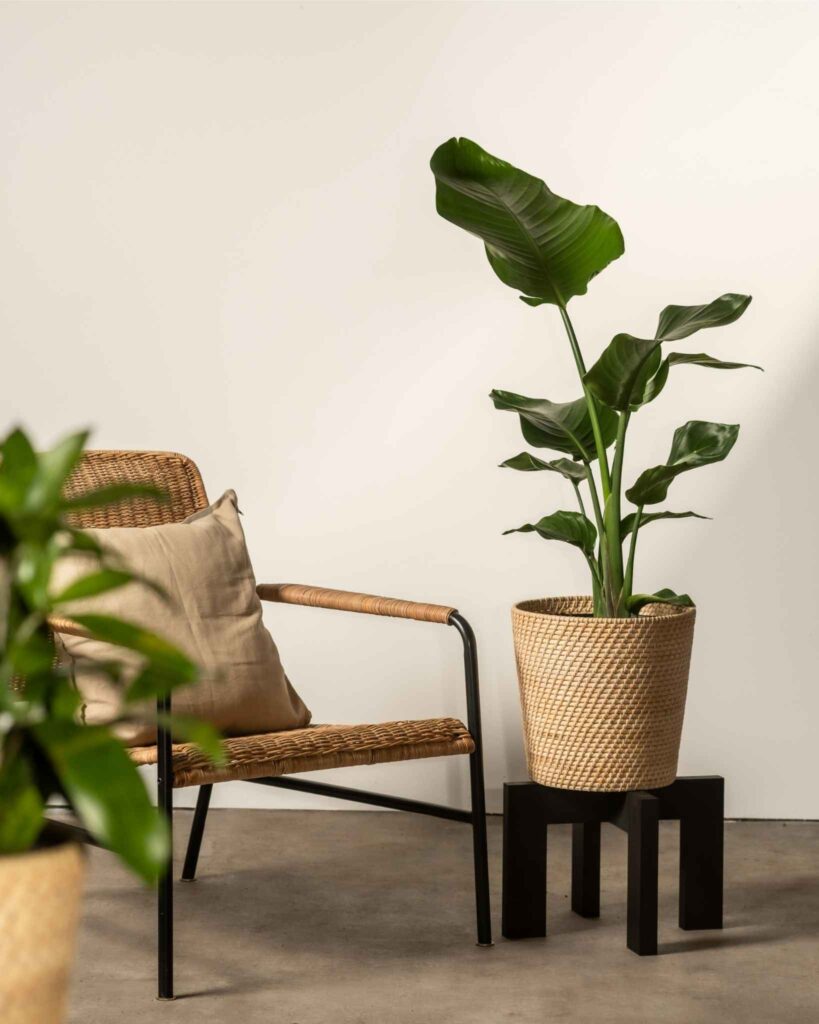 Outra dica interessante é usar vasos altos para valorizar o formato da planta e equilibrar a proporção do espaço. Enquanto isso, o uso de cachepôs de fibras naturais reforça a sensação de leveza e harmonia.